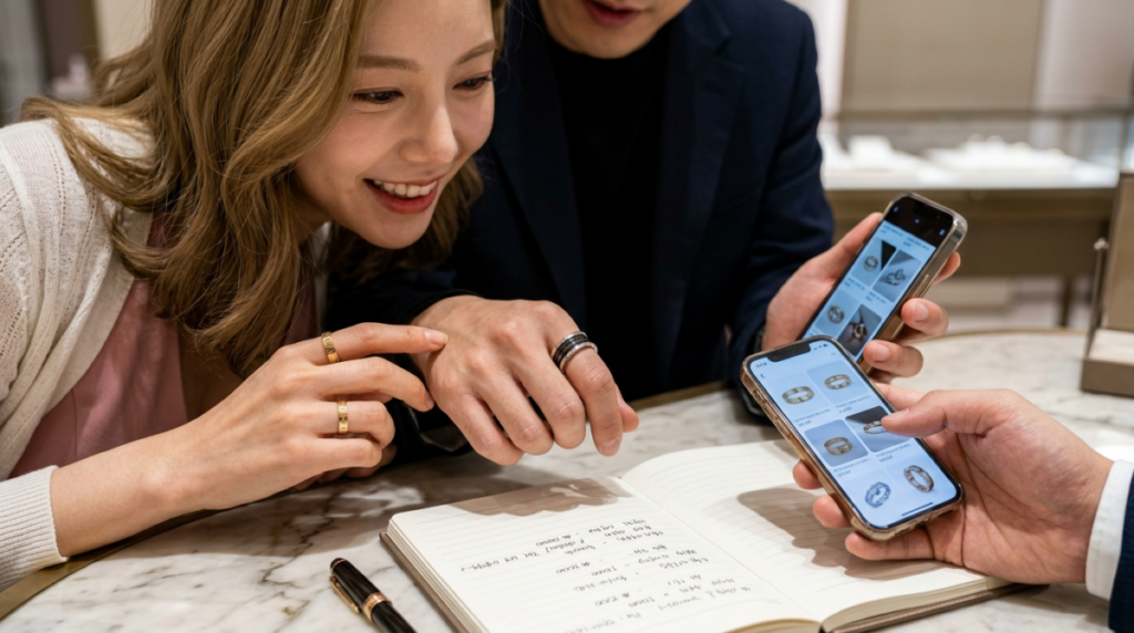 무작정 백화점으로 향하는 것보다, 미리 온라인으로 손품을 파는 것이 중요합니다. 최소 3~5개 브랜드의 공식 홈페이지나 SNS를 통해 대표 디자인(예: 까르띠에 러브링, 불가리 비제로원, 티파니 밀그레인)을 미리 살펴보세요. 마음에 드는 디자인을 2~3개씩 캡처해 우리 커플만의 위시리스트를 만들면, 투어 당일 훨씬 효율적으로 상담받을 수 있습니다.