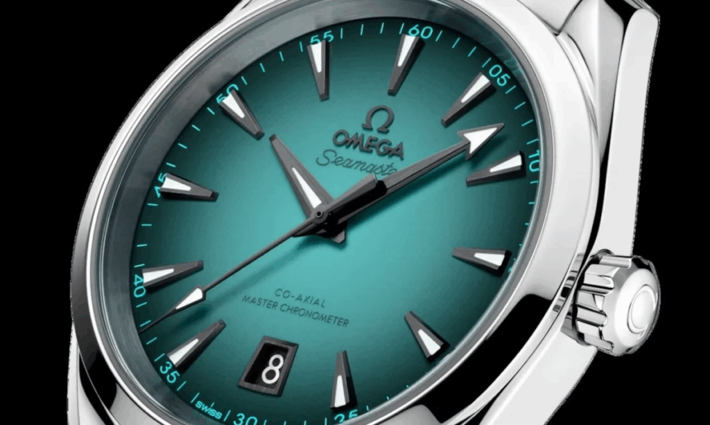 그라데이션 터쿼이즈 컬러가 다이얼 전체에 퍼지며, 150m 방수와 마스터 크로노미터 인증 무브먼트를 갖췄습니다.